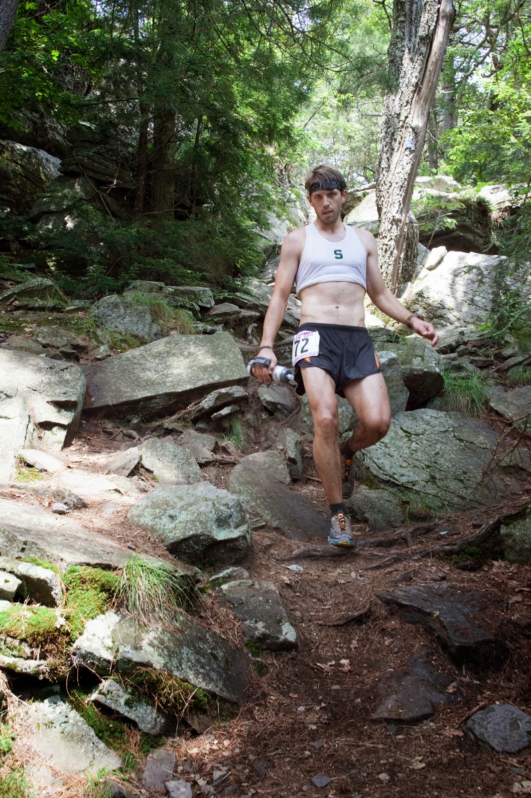 With lubed up armpits and some pretzels for the road, I was back to running and ascending again. The next big peak was Blackhead a few miles ahead and I knew it was the steepest. So when I wasn't thoughtfully planning my next step from wet rock to potential ankle-breaking muddy rock, I was thinking about the 1,000ft ascent over the next mile. Again, I passed a bunch of guys on the uphills and started to doubt if I was running this race correctly - hard on (giggle) the uphills, easy/safe on the downhills. Would the other way around be faster? I was making significant gaps on the faster descenders and didn't feel like I was trashing my legs so it must have been working well enough.